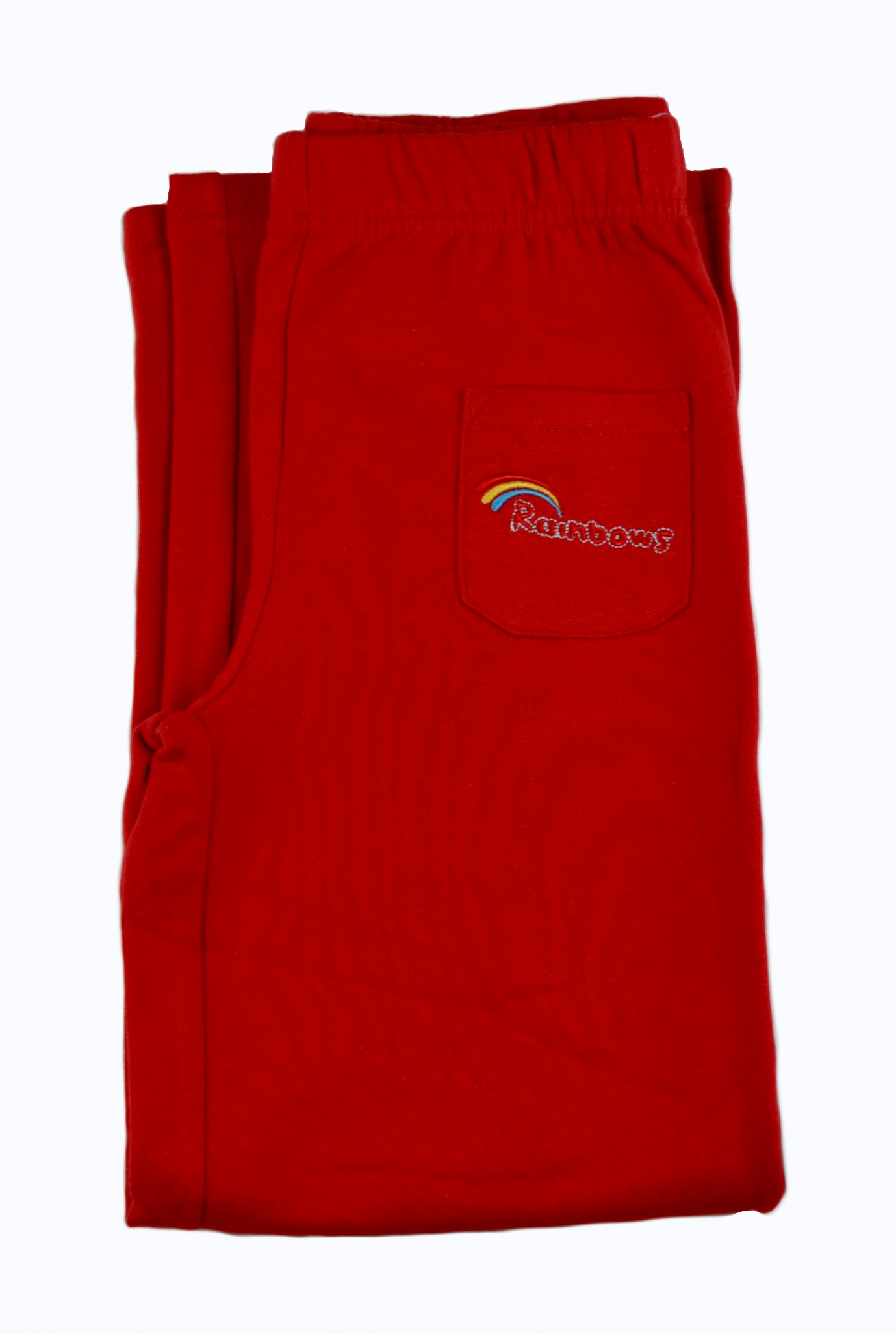 Official Rainbows Jog Pants. These quality jog pants will keep your child warm when out of doors and protected against falls when indoors. They have a small front patch pocket which features the embroidered Rainbow logo.